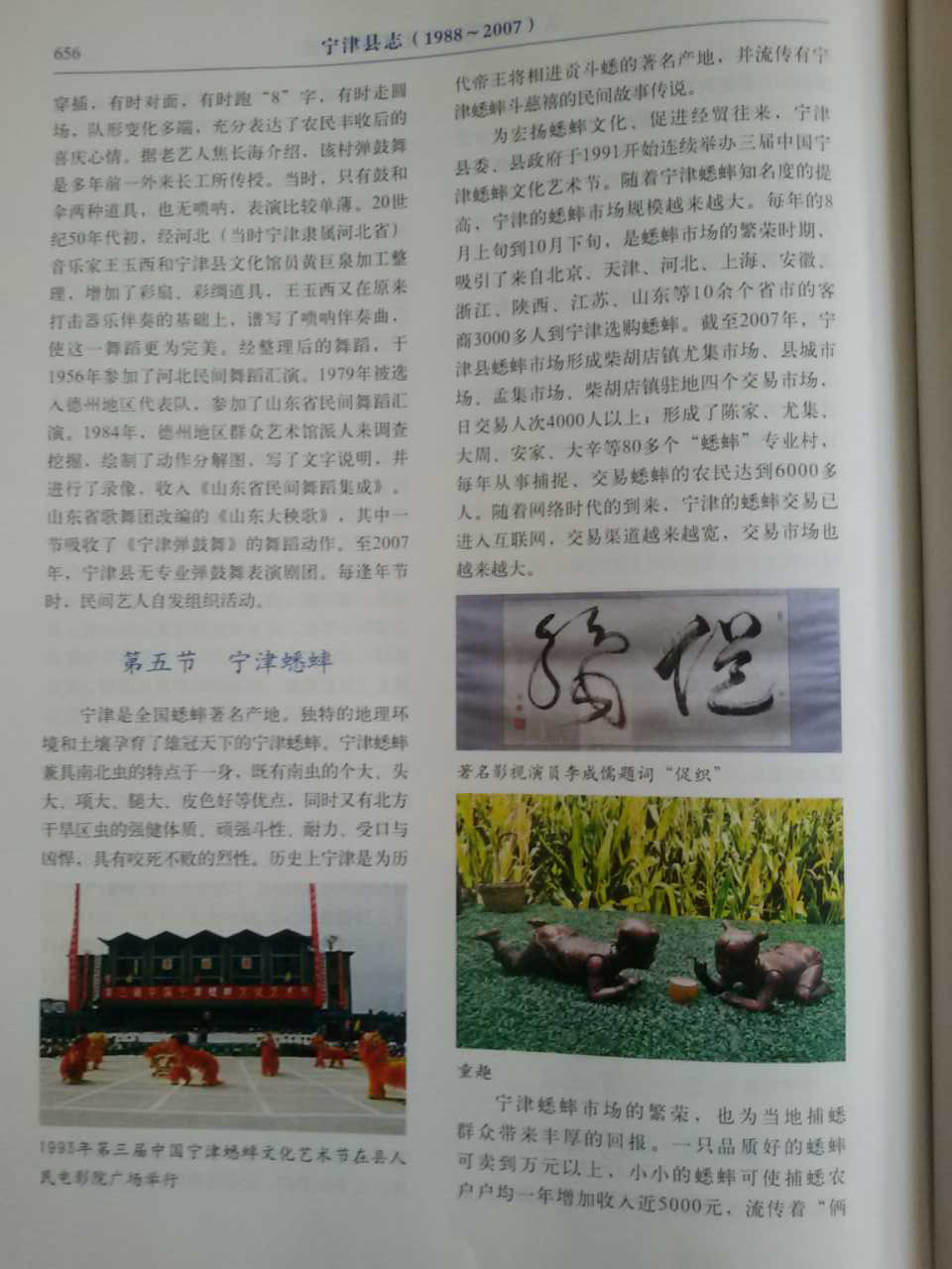近几年,宁津县把开发蟋蟀资源当作一项重要工作来抓,与中科院联合成立了“宁津县蟋蟀研究会”,聘请中科院吴继传教授为名誉理事长兼技术总顾问,同时编写出版了《中国宁津蟋蟀志》一书,组织了中国宁津蟋蟀节。