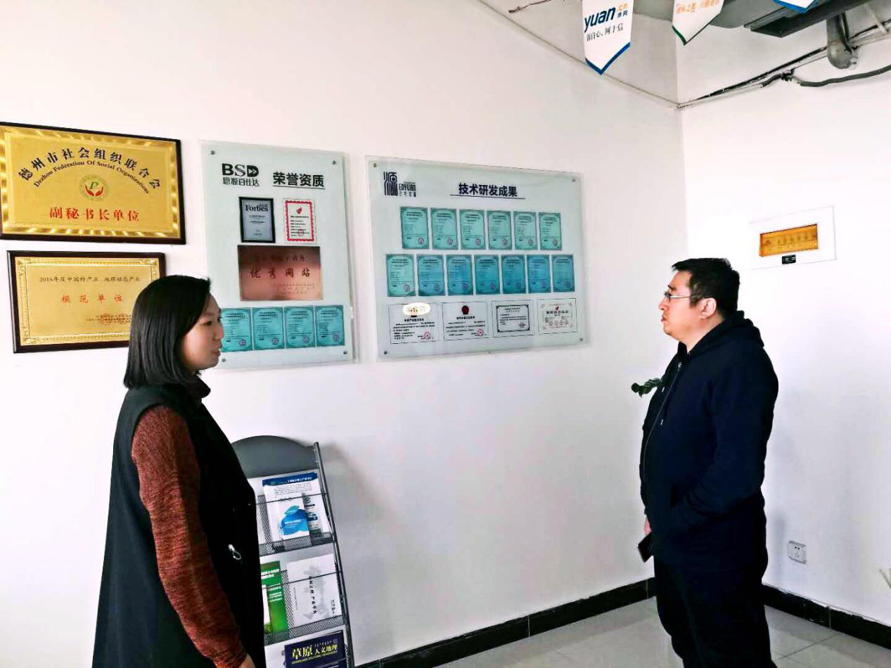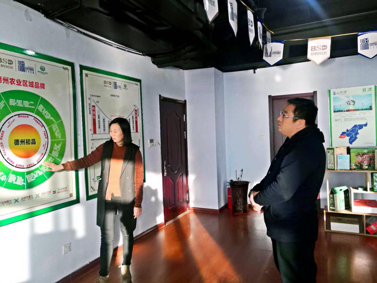 回到公司后边新燕带领刘区长和魏主任参观了公司各业务展厅,详细介绍了公司自2013年落地德州以来在地理标志产品行业开展的工作以及取得的案例、成果及荣誉,以地理标产品品牌培育业务为切入口,带动农业信息化及标准化业务、农产品区域公用品牌业务,打造品牌农业,提升农产品附加值、提升农业供应水平。