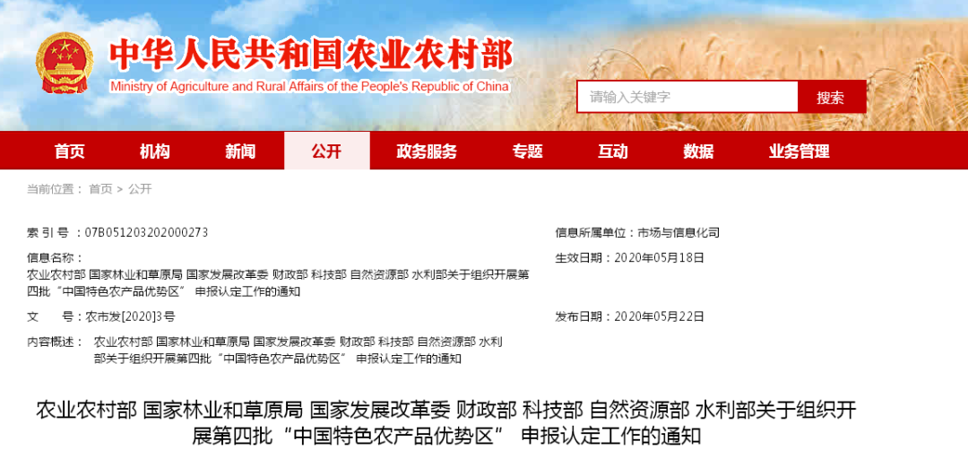 22日,农业农村部、国家林业和草原局、国家发展改革委、财政部、科技部、自然资源部、水利部发布关于组织开展第四批“中国特色农产品优势区” 申报认定工作的通知。