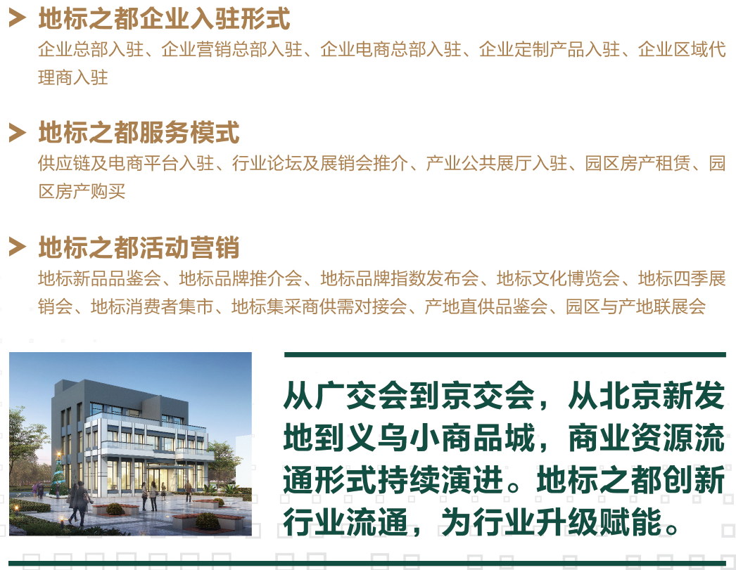 地标之都将全国2800多个县的10000余种地标产品的文化展示、创意研发、线上线下体验展销引入,为国内外客户提供买地标、卖地标、体验地标文化的一站式服务,成为全国规模最大、最权威的地标产品综合运营总部基地,打造全国地标产业集聚中心、地标文化体验中心、地标产品交易中心。