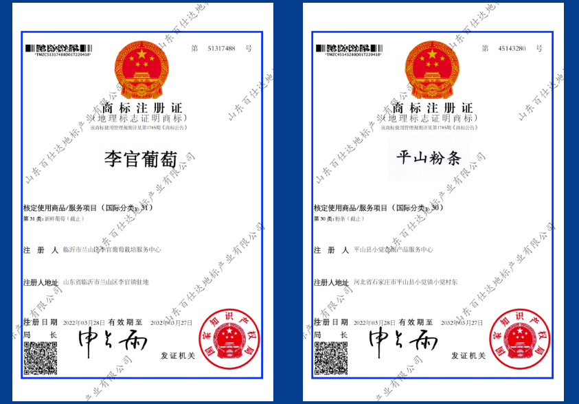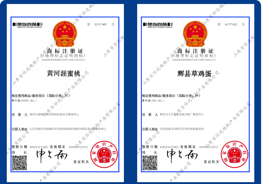 黄河涯蜜桃、辉县草鸡蛋、李官葡萄、平山粉条、饮州黄瓜皮、下野地樱桃下发地理标志证明商标证书。(通讯员:李倩倩)