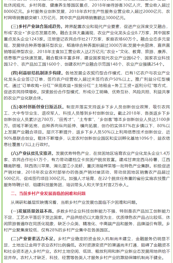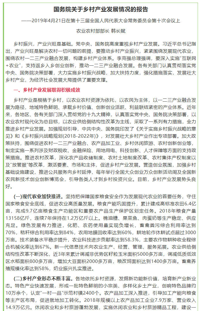 国务院关于乡村产业发展情况的报告