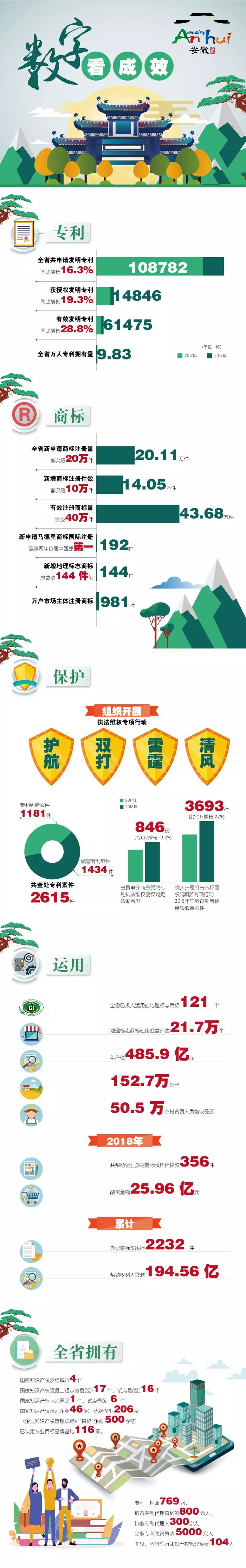 知识产权是一个地区经济核心竞争力的标志,安徽省市场监管部门秉承服务大局、激励创新的初心,强化顶层设计和政策引导,为知识产权擘画出清晰的发展路径。2018年,安徽先后印发《2018年安徽省知识产权战略实施工作要点》《2018年全省实施商标品牌战略工作要点》《2018年安徽省专利事业发展战略推进工作实施方案》等政策性文件,聚焦安徽优势产业发展,大力培育和支持战略性新兴产业、现代制造业、现代服务业、现代农业等产业发展自主知识产权,打造核心竞争力。