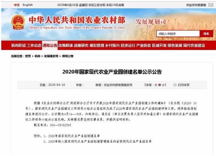 根据《农业农村部办公厅 财政部办公厅关于开展2020年国家现代农业产业园创建工作的通知》(农办规〔2020〕10号),国家现代农业产业园建设工作领导小组办公室组织完成了2020年国家现代农业产业园创建评审工作。现将拟批准创建名单进行公示,公示期为4月16—18日。如有异议,请实名(单位主要负责人签字并加盖公章)向国家现代农业产业园建设工作领导小组办公室反映。反映情况要坚持实事求是,并提供证明材料。
