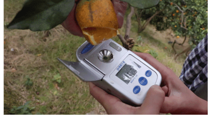 好的冰糖橙口感沁甜,酸味微乎其微,而且不是齁甜,而是像冰糖一样十分清爽的甜。果农大哥随手摘下了一颗测甜度,就已经达到了16.4°!