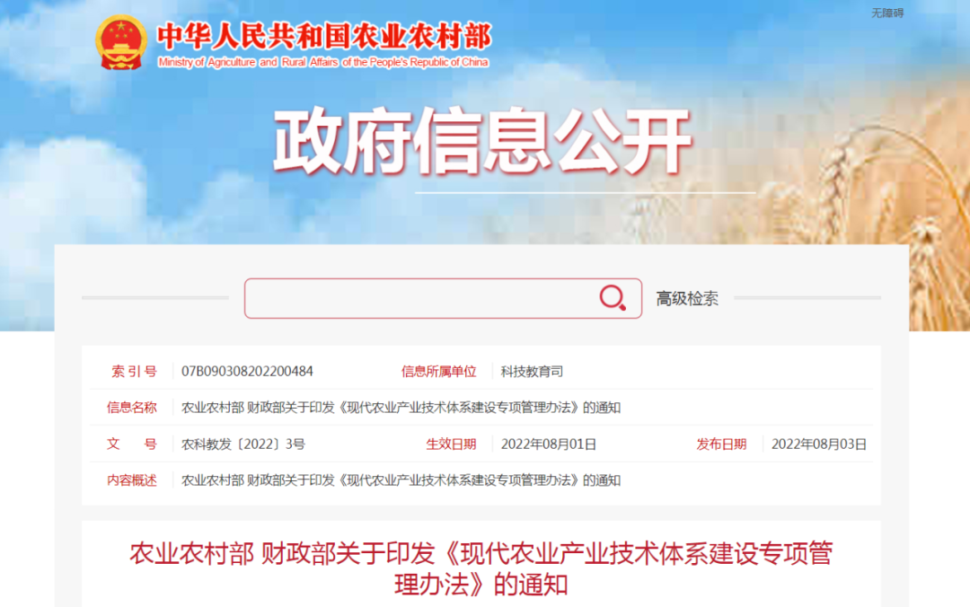 农业农村部 财政部关于印发《现代农业产业技术体系建设专项管理办法》的通知